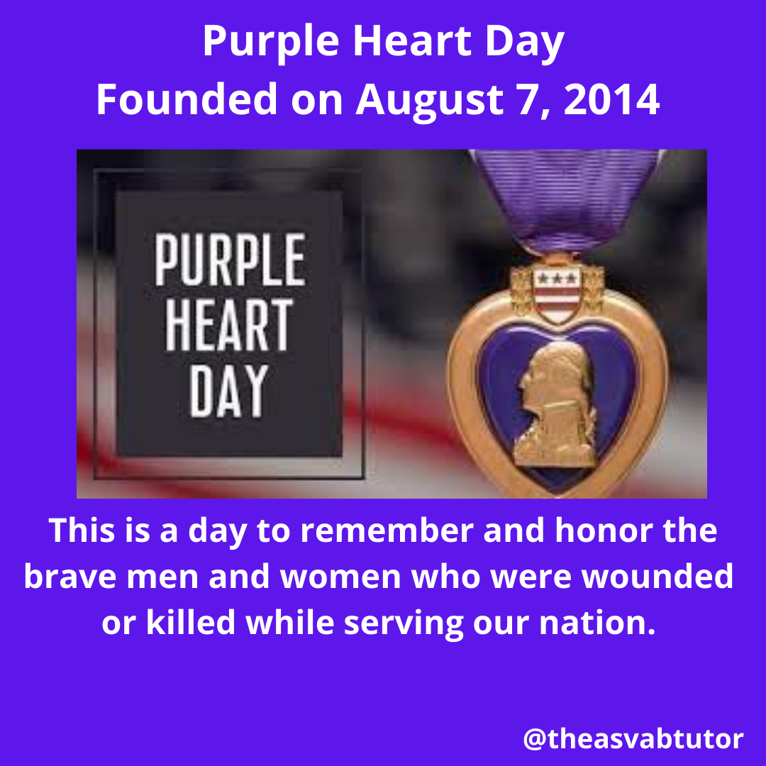 As an ASVAB tutor, I mention military holidays, observances, and anniversaries in my blogs. Today, August 7, is Purple Heart Day. Purple Heart Day is a day for Americans to remember and honor the men and women who bravely served their country and were wounded or killed while serving in the United States military. The origin of the Purple Heart lies with George Washington. The original name of the Purple Heart was the Badge of Military Merit. George Washington was awarded the original Purple Heart in 1782. The Continental Army had limited funds at the time. The award served as a way to honor enlisted people who were worthy of recognition. This award is given to soldiers for one meritorious action. The original design was a purple heart shaped piece of silk with a thin edge of silver. Washington only gave out three Purple Hearts himself. He gave his subordinates the authority to award people with the Purple Heart. 1.8 million Purple Hearts have been awarded throughout the years. 2004 was the first year that Purple Heart Day was observed. The present-day Purple Heart has a golden image of George Washington overlaying a purple heart background.