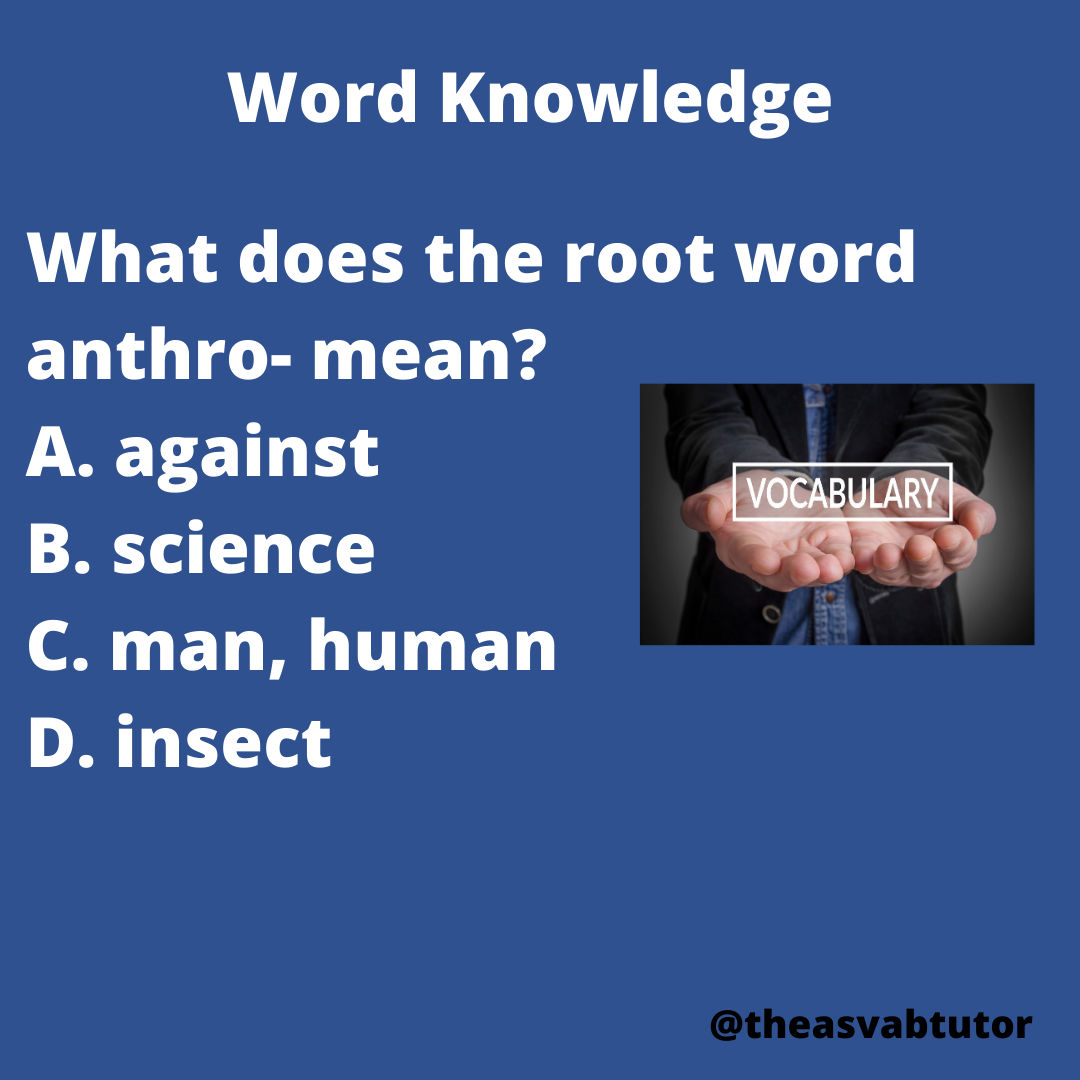 In my role as an ASVAB tutor, I emphasize the importance of studying root words. Knowing Latin and Greek root words leads to improvement in vocabulary scores. In my book, The ASVAB Tutor’s Word Knowledge and Paragraph Comprehension Study Guide, I include over 500 vocabulary words. In addition to the vocabulary words, I also include prefixes, root words, and suffixes. Do you know what the Greek root word anthro- means? I will present the answer tomorrow.