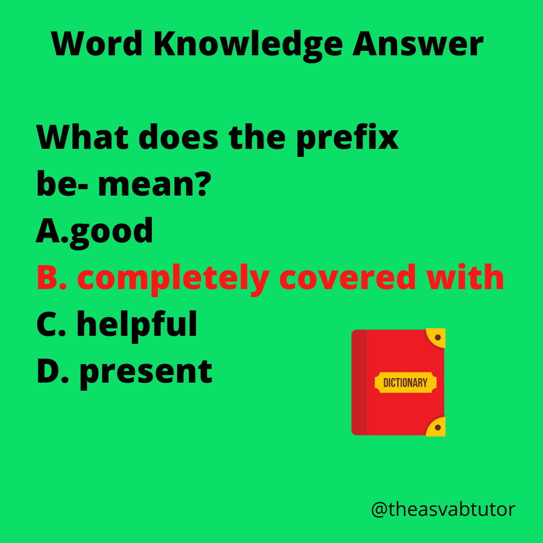 Be- means completely. Knowing one prefix can expand your knowledge of vocabulary. One prefix might be seen in 15 or 20 different words. Knowing the meaning of the prefix is a great help in figuring out the meaning of an unknown word, especially on a multiple-choice test. Here are examples of words with the prefix be-: bedazzle, befall, beloved, begotten, behold, bejewelled, belabor, belie. In working as an ASVAB tutor, I remind my students of the importance of knowing the meaning of Latin and Greek prefixes, root words, and suffixes in order to boost their vocabulary score on the ASVAB.