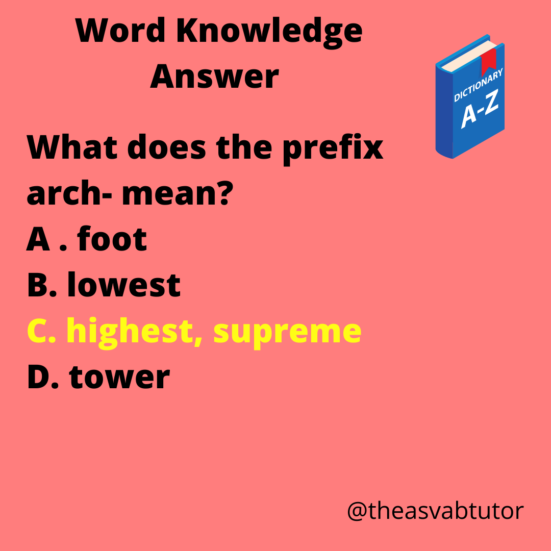 Arch- is one of the roots that I present in my ASVAB study guide entitled, The ASVAB Tutor’s Word Knowledge and Paragraph Comprehension Study Guide. Did you know what arch- means? It means highest or supreme. Studying prefixes, root words, and suffixes positively affects ones ASVAB vocabulary score. Knowing just one root word could lead to knowing the meaning several words. Make sure you review ASVAB vocabulary and study the Latin and Greek prefixes, root words, and suffixes.