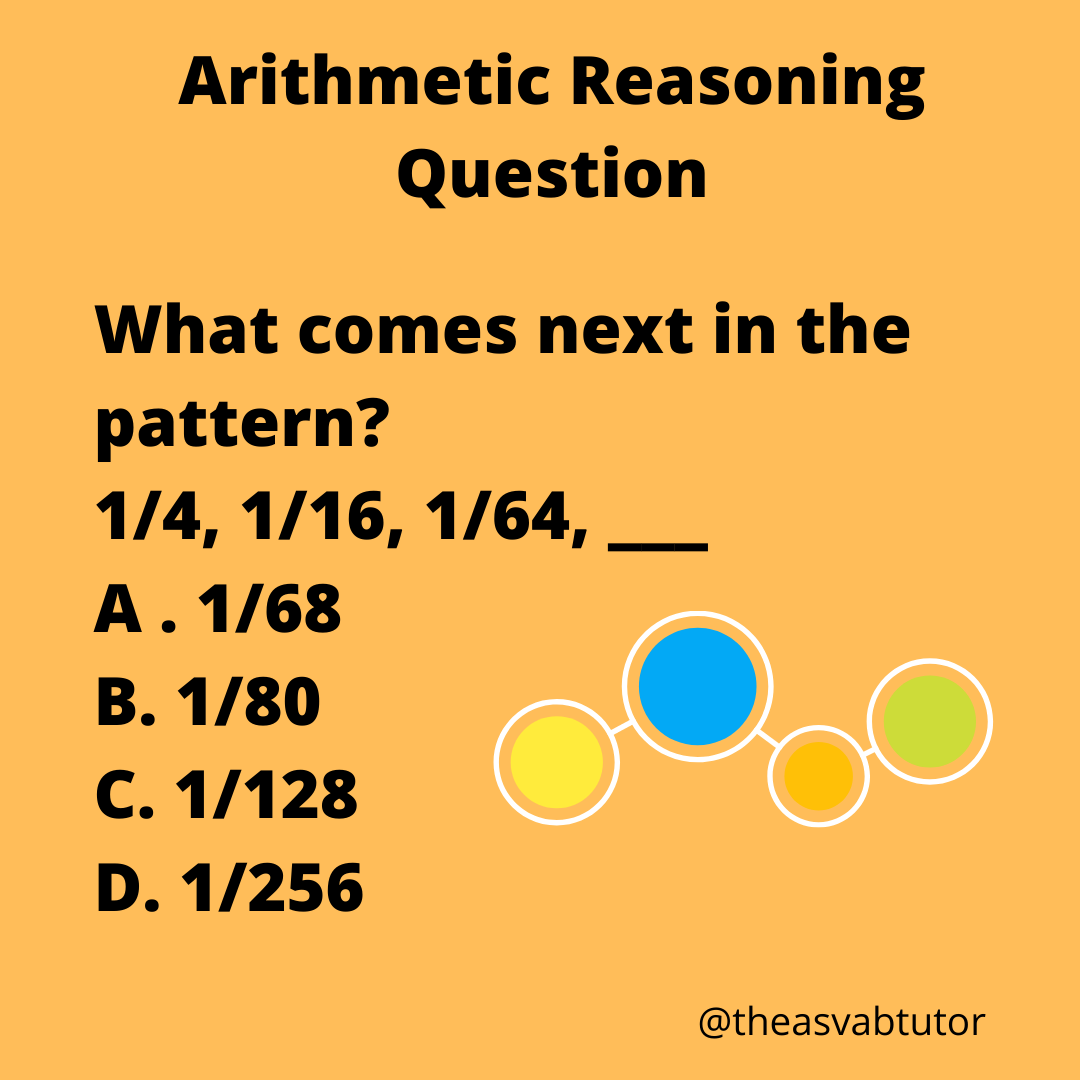 Today I am presenting an example of patterns and sequences that I present in my job as an ASVAB tutor. This is a topic that I make sure to present in my ASVAB prep course and have included in my book, The ASVAB Tutor’s Arithmetic Reasoning Study Guide. Some people are overwhelmed when they see fractions in a sequence problem. I remind my students that if numbers are going up in a pattern it is either addition or multiplication. If numbers are going down in a pattern it is either subtraction or division. Can you see the pattern in this example? The answer will be revealed tomorrow.