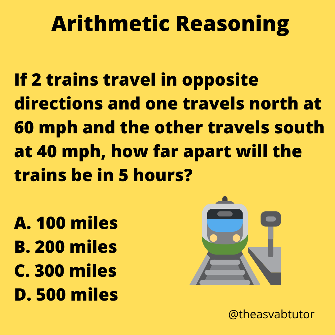 One topic in Arithmetic Reasoning that many students are intimidated by is the topic of distance and rate. I included the topic of distance and rate in my book entitled, The ASVAB Tutor’s Arithmetic Reasoning Study Guide. Many people are overwhelmed when they see questions on trains moving opposite directions. I tell my students that these are some of my favorite questions. I remind them that when they see how easy they are, they will like them best too. Today’s question is: If 2 trains travel in opposite directions and one travels north at 60 mph and the other travels south at 40 mph, how far apart will they be in 5 hours? Do you know how to solve this problem? I will present the answer and explanation tomorrow.