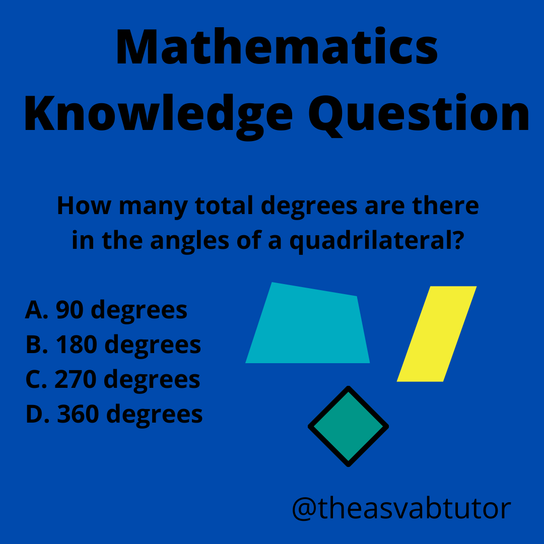 In working as an ASVAB tutor, I saw the importance of writing ASVAB study guides. One of the books I wrote is entitled, The ASVAB Tutor’s Mathematics Knowledge Study Guide. In this book I cover topics of algebra and geometry. In my ASVAB prep course, I place a strong emphasis on knowing formulas and shapes to help improve my students’ ASVAB math scores. Do you know how many total degrees are in the angles of a quadrilateral? The answer will be posted tomorrow.