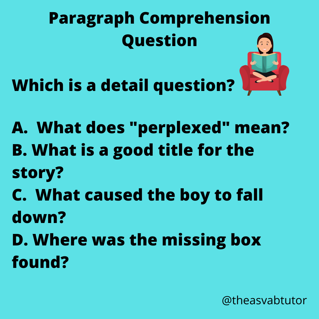 Today’s post asks which of the questions is a detail question. On the Paragraph Comprehension section of the ASVAB it is important to be able to recognize the different types of questions can appear. Detail questions are a common type of reading comprehension question. As an ASVAB tutor, I remind my students that detail questions do not ask about the main idea of the story. Instead, they focus on small parts of the story. Do not rely on your own background knowledge to answer detail questions. The answer lies within the story.