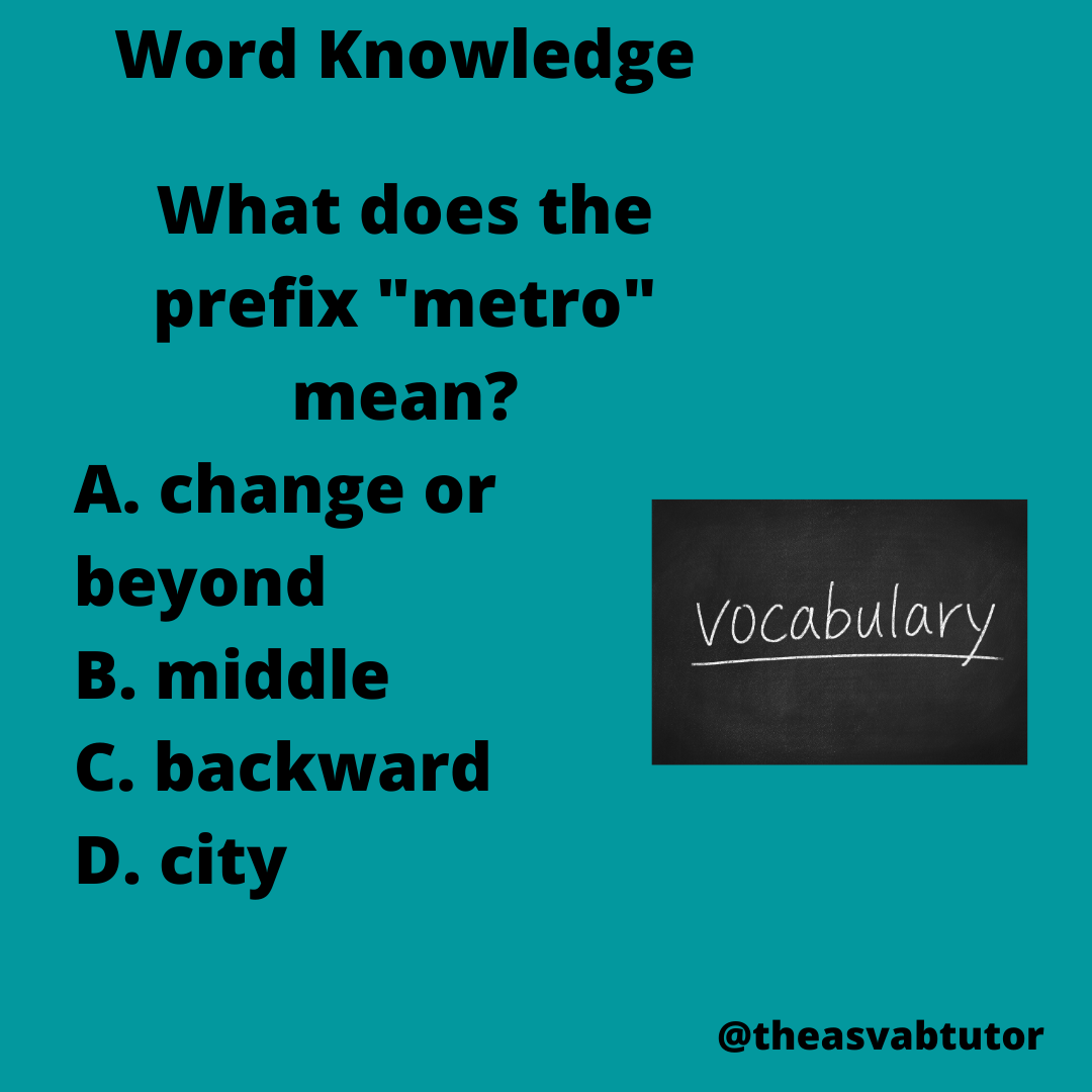 their vocabulary scores. In my book entitled, The ASVAB Tutor’s Word Knowledge and Paragraph Comprehension Study Guide, I included charts of many prefixes, root words, and suffixes to enhance my students’ vocabulary levels. Tomorrow I will present the meaning of the prefix meta-.