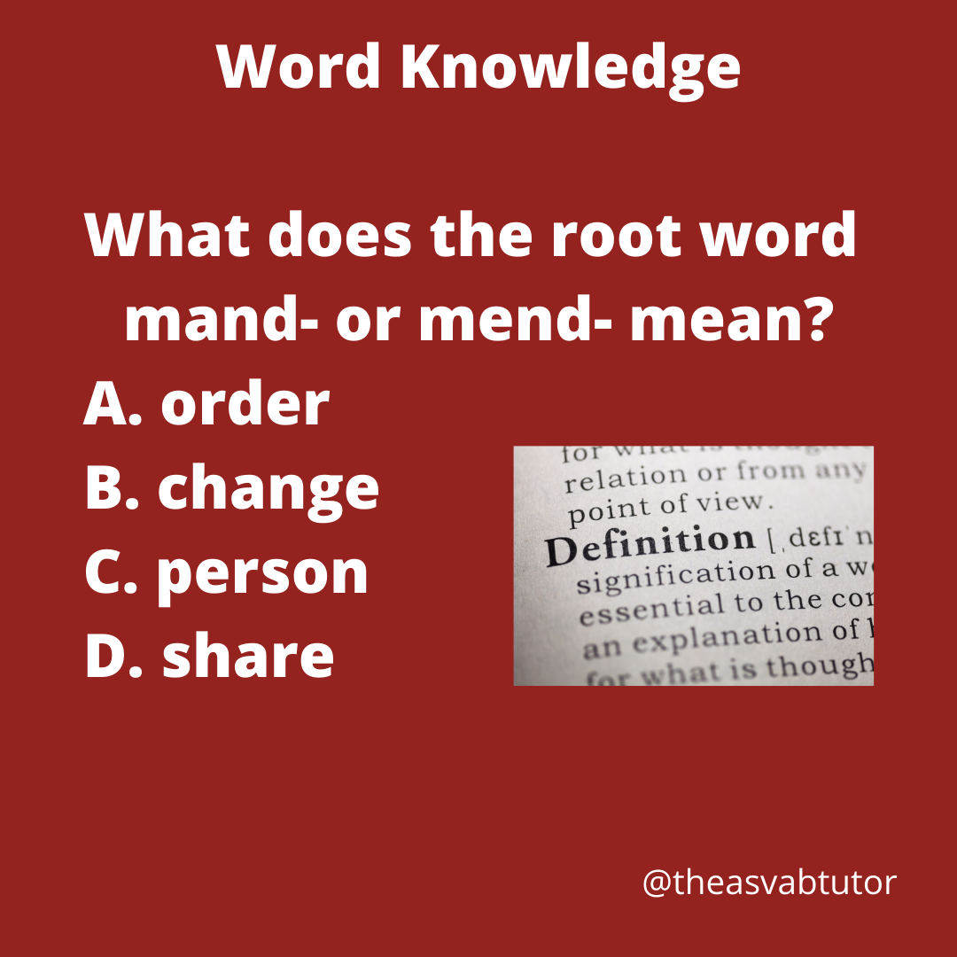 As an ASVAB tutor, I remind my student of the importance of review Latin and Greek root words. Today’s post is about the Latin root mand- or mend-. Do you know its meaning? I remind my students of the importance of studying prefixes, root words, and suffixes. Too many students say that studying vocabulary is not worth it because you never know what words will be on the test. The truth is if you do not prepare, your chances of improving are 0%. I advise them to take their chances on studying. I will present the meaning of mand- or mend- tomorrow.