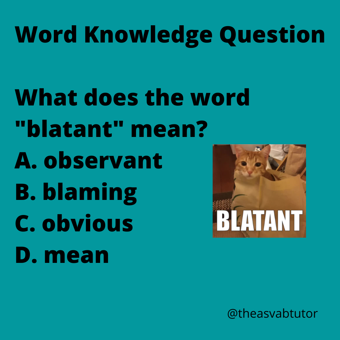 In working as an ASVAB tutor, I remind my students of the importance of studying ASVAB vocabulary. My book on Amazon, entitled The ASVAB Tutor’s Word Knowledge and Paragraph Comprehension Study Guide covers over 500 ASVAB vocabulary words. One of these words is the word “blatant”. The word “blatant” does not consist of any Greek or Latin root words or any prefixes or suffixes. It is the type of word that you either know or do not know. Do you know what it means? I will be presenting the answer tomorrow.
