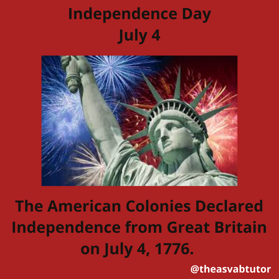 As an ASVAB tutor, I have decided to present numerous military holidays, observances, and anniversaries in my blog. Today is July 4, Independence Day. This is the day when America celebrated independence from Great Britain. It is a federal holiday in the United States. On July 4, 1776, the Declaration of Independence, was ratified by the Second Continental Congress. This was the establishment of the United States of America. On this date, the Founding Fathers declared that the thirteen colonies were no longer under the rule of the British king, King George III.