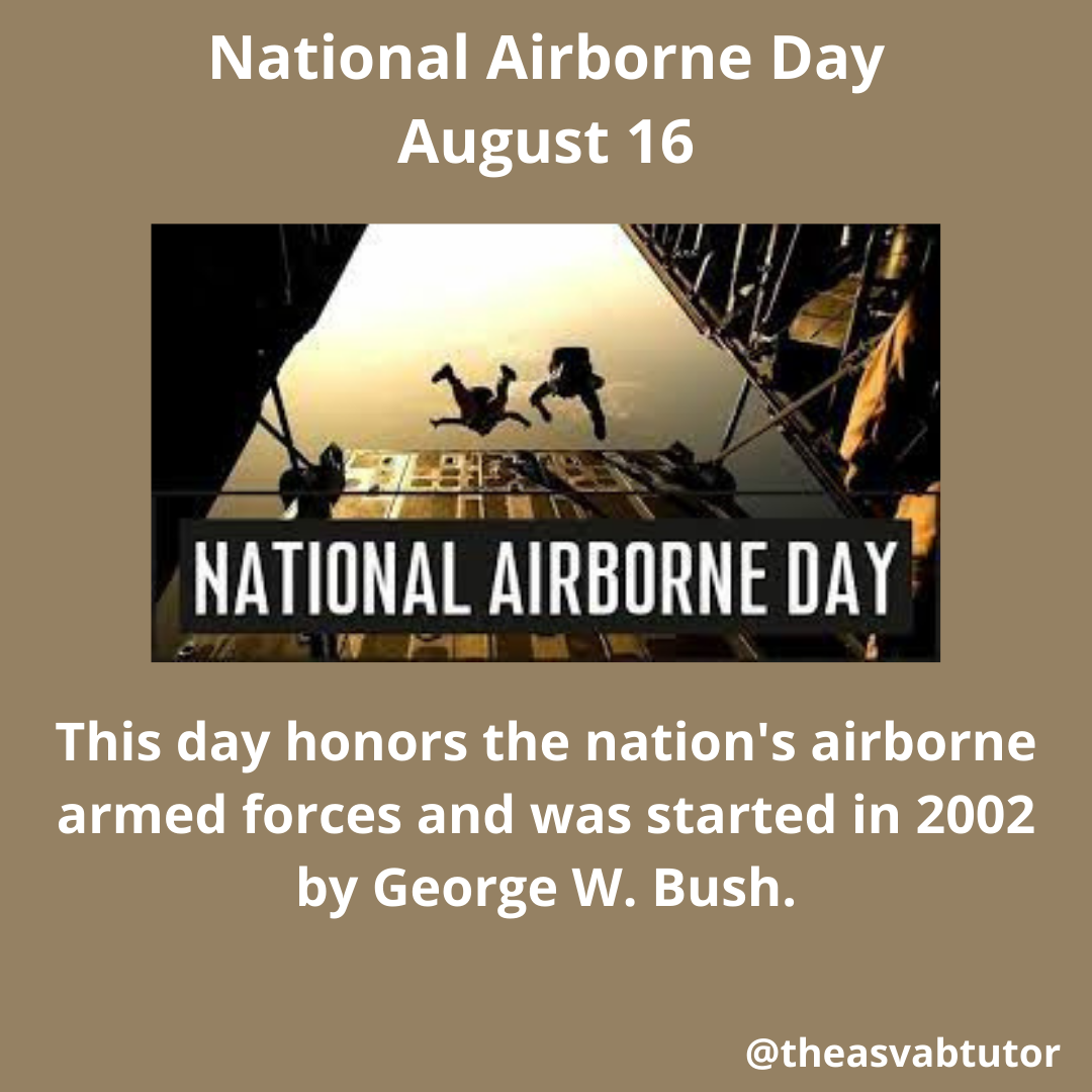 In working as an ASVAB tutor, I choose to honor numerous military holidays, observances, and anniversaries. Today is one of those days. August 16 is National Airborne Day. National Airborne Day was designated by the United Stated Congress to honor the airborne forces of the United States Armed Forces. President George W. Bush created this day of recognition in 2002.