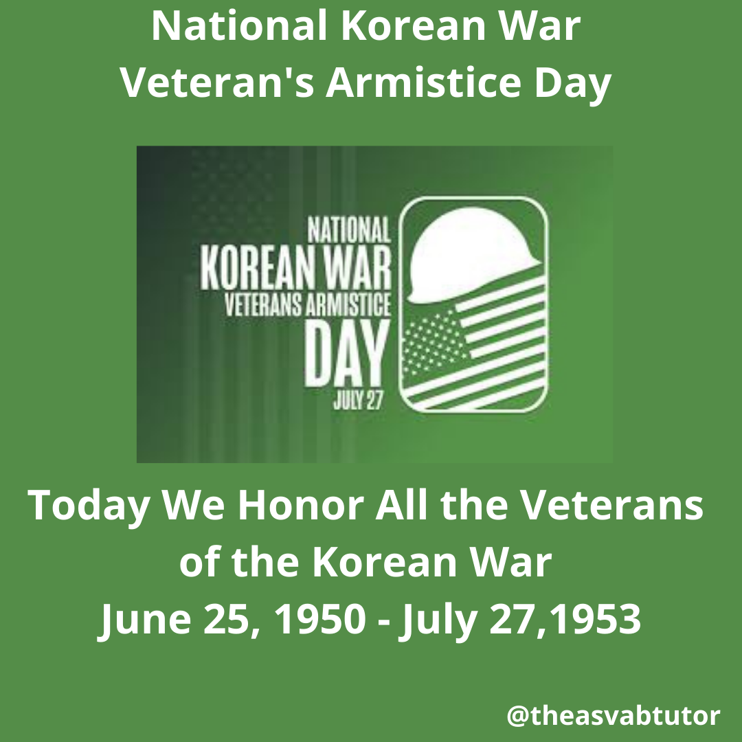 As an ASVAB tutor, I have chosen to make posts about the different military holidays, observances, and anniversaries. Today is one of those days. Today, July 27, is National Korean War Veterans’ Armistice Day. On this day, the United States recognizes and pays tribute to the veterans of the Korean War. The Korean War started on June 25, 1950. The North Korean army invaded South Korea. North Korea was supported by China and the Soviet Union. South Korea was supported by the United States and allied countries. As a result of the war, North Koreas gain the city of Kaesong but lost 3,900 km2 (1,506 sq mi) including the city of Sokcho, to South Korea. The war officially ended on July 27, 1953. This was the day that the Korean Armistice Agreement was signed.