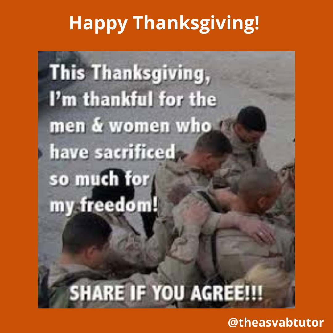 As an ASVAB tutor, I like to take time to honor America’s holidays. Today is Thanksgiving. It is a federal holiday, a day in which we give thanks. This holiday has its origins in 1621. The Plymouth colonists and the Native Americans shared an autumn harvest feast. This is recognized today as one of the first Thanksgiving celebrations in the colonies. In September 1620, the small ship known as the Mayflower left Plymouth, England carrying 102 passengers. They were seeking religious freedom. The trip was dangerous and uncomfortable and lasted 66 days. The Pilgrims arrived in Massachusetts Bay and established a village at Plymouth. Their first winder was brutal, and only half of the original people survived until spring.