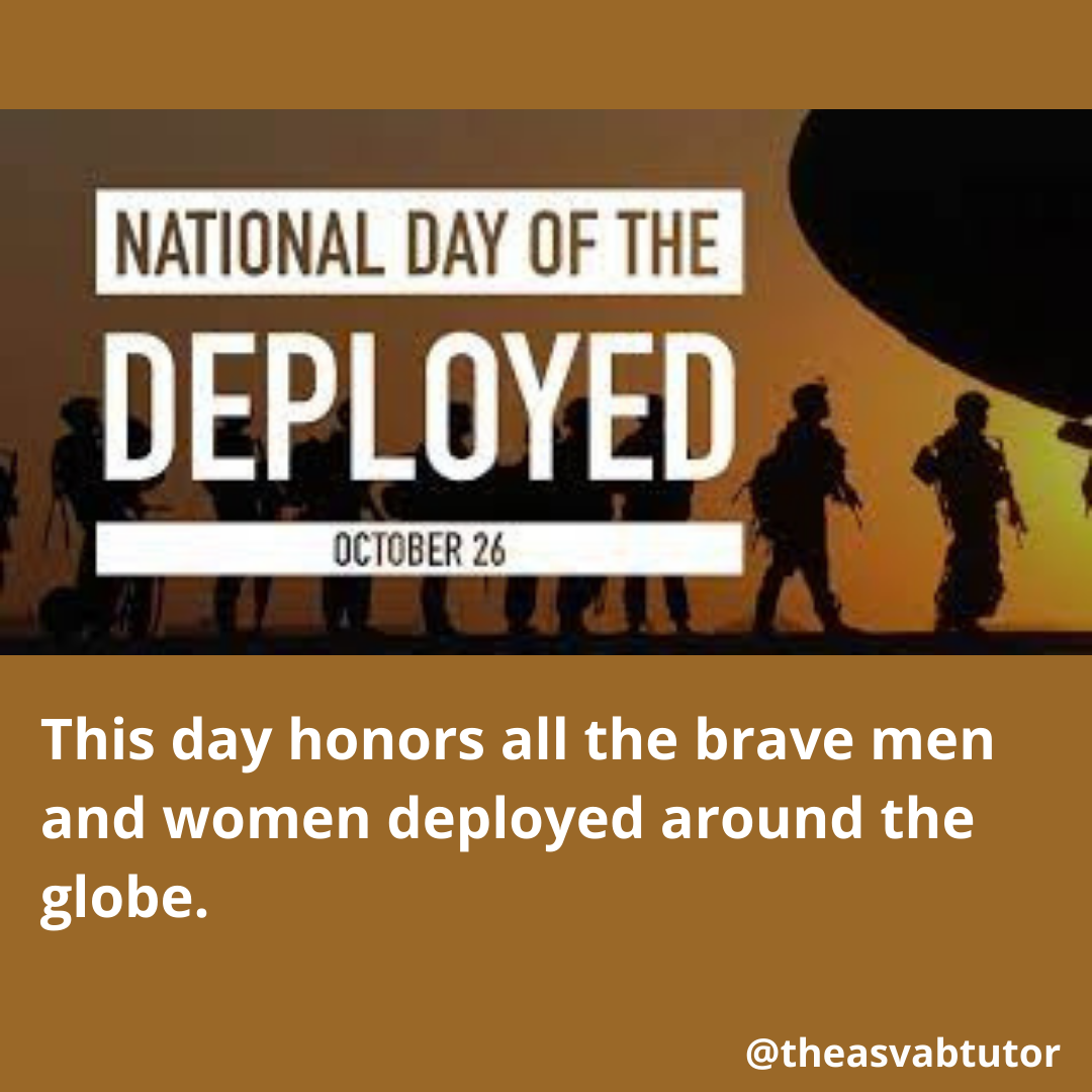 In working as an ASVAB tutor, I have chosen to recognize the United States military holidays, observances, and anniversaries. Today is one of those days. Today, October 26, is the Day of the Deployed. This holiday honors the United States military personnel deployed around the globe. The history of the National Day of the Deployed dates back to 2006 when Shelle Michaels Aberle, a North Dakota resident approached the North Dakota governor, John Hoeven, to support a proclamation for a day to honor those men and women actively serving in the military outside the United States. The date, October 26, was chosen as the date of observance because it was the birthday of Aberle’s cousin, U.S. Army Lt. Col. David Hosna, who was actively serving in Iraq at the time. In 2011, Hoeven was a United States Senator. He presented the resolution that designated October 26 as the National Day of the Deployed. His resolution passed unanimously. Since then, all 50 states have observed this holiday. On this day, take time to remember, honor and thank the dedication of our deployed military displays for our country.